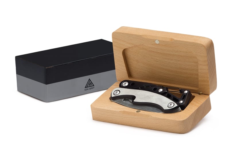 Ergonomically designed 10 function multi tool, includes a nylon pouch with velcro closure and belt loop. All displayed in a beech wood bespoke box with magnetic closure, supplied in an Ion Grit presentation box.